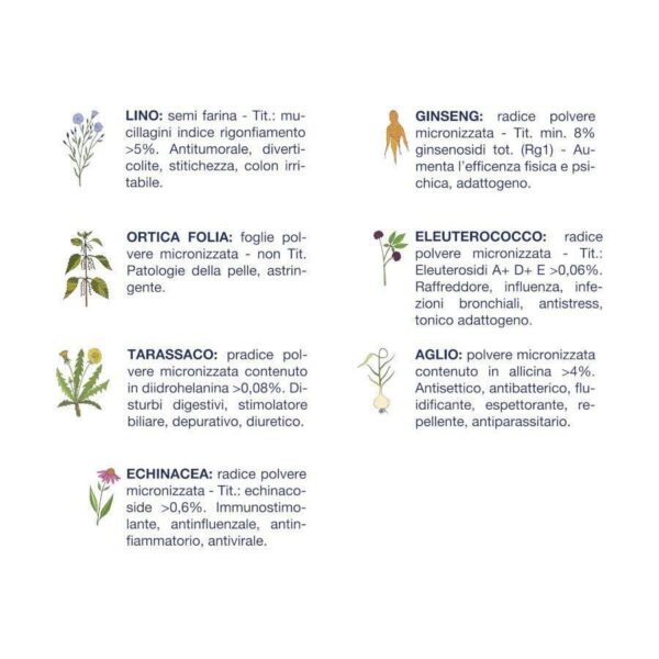 Maiale 80% (Totalità delle carni), Patate 15%, Erbe Officinali (Lino, Ortica Folia, Tarassaco, Eleuterococco, Echinacea, Ginseng, Aglio) 0,05% , vitamine, olio di semi, sostanze minerali.