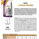Composizione: Cereali (riso 4%), carni e derivati 36% (pollo carne fresca 8%, tacchino carne fresca 8%), oli e grassi (olio di salmone 0,5%), pesci e sottoprodotti dei pesci, ortaggi, sottoprodotti di origine vegetale (fruttoligosaccaridi FOS 0,5% e yucca schidigera 0,1%), lieviti (mannano-oligo-saccaridi MOS 0,5%), sostanze minerali.